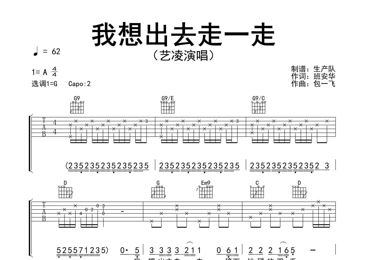 《我想出去走一走》是艺凌演唱的一首歌曲,精编完美版,拍号为4/4拍,歌曲速度为每分钟62拍,歌曲原调为A调,但由于原调指法比较难,为了方便弹奏,本吉他谱采用的是G调指法编配,变调夹2品弹奏即为原调,当然也可以根据自己的音域改变变调夹位置,或者通过改变和弦调性,以方便自己弹奏,这份吉他谱共有三张高清图谱,图谱由 @生产队 编配上传,图谱使用六线谱编配,包含吉他和弦指法、简谱以及歌词部分,使用这份我想出去走一走吉他谱,可以让你更加方便地掌握这首歌曲的弹唱技巧,快来尝试吧。《我想出去走一走》是由艺凌演唱的一首歌曲,本吉他谱根据原版G调指法编配,精准的前奏、间奏、尾奏及SOLO编配,值得推荐的作品!。
