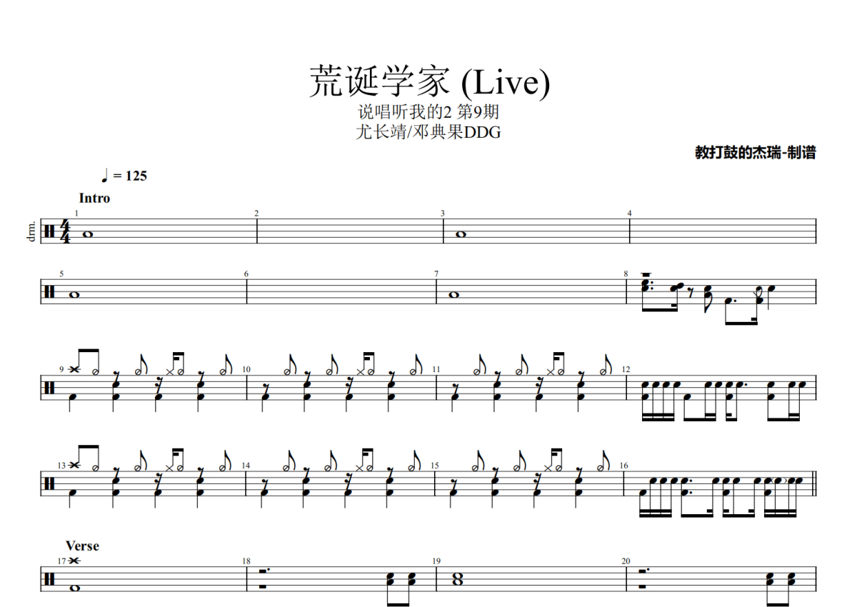 《荒诞学家》是尤长靖/邓典果DDG演唱的一首歌曲,说唱听我的2 第9期 (Live),拍号为4/4拍,歌曲速度为每分钟125拍,这份架子鼓谱共有四张高清图谱,图谱由 @Jerry 编配上传,图谱使用五线谱编配,使用这份荒诞学家架子鼓谱,你将能够轻松地敲打出这首尤长靖/邓典果DDG的荒诞学家,快来尝试吧。