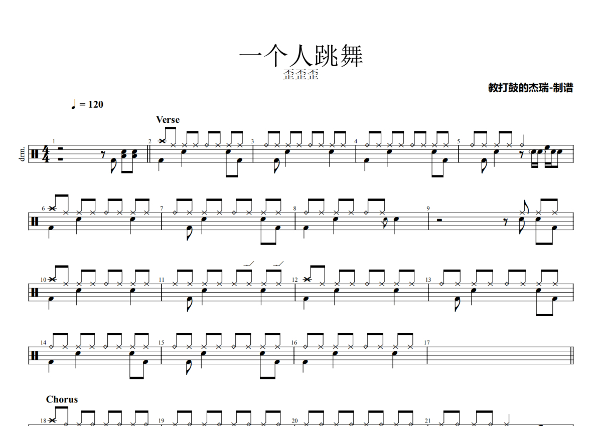 《一个人跳舞》是歪歪歪演唱的一首歌曲,拍号为4/4拍,歌曲速度为每分钟120拍,这份架子鼓谱共有两张高清图谱,图谱由 @Jerry 编配上传,图谱使用五线谱编配,使用这份一个人跳舞架子鼓谱,你将能够轻松地敲打出这首歪歪歪的一个人跳舞,快来尝试吧。