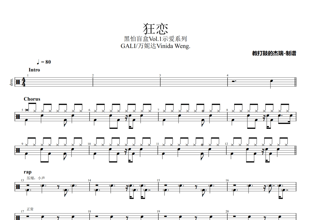 《狂恋》是GALI/Vinida万妮达演唱的一首歌曲,拍号为4/4拍,歌曲速度为每分钟80拍,这份架子鼓谱共有两张高清图谱,图谱由 @Jerry 编配上传,图谱使用五线谱编配,使用这份狂恋架子鼓谱,你将能够轻松地敲打出这首GALI/Vinida万妮达的狂恋,快来尝试吧。