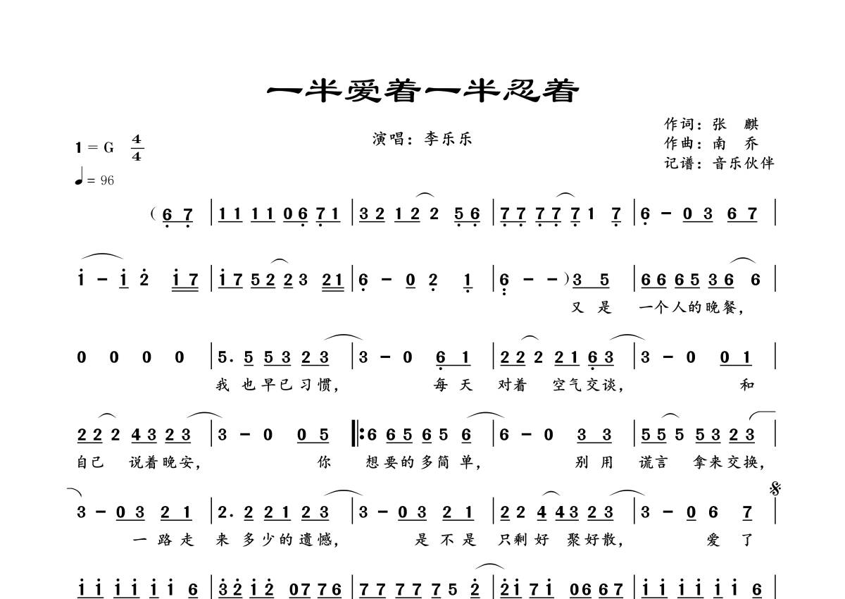 《一半爱着一半忍着》是李乐乐演唱的一首歌曲,拍号为4/4拍,歌曲速度为每分钟96拍,这份简谱共有一张高清图谱,图谱由 @音乐伙伴 编配上传。