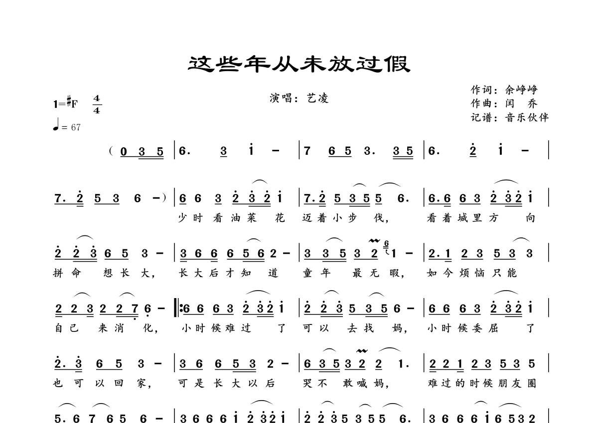 《这些年从未放过假》是艺凌演唱的一首歌曲,拍号为4/4拍,歌曲速度为每分钟67拍,这份简谱共有一张高清图谱,图谱由 @音乐伙伴 编配上传。