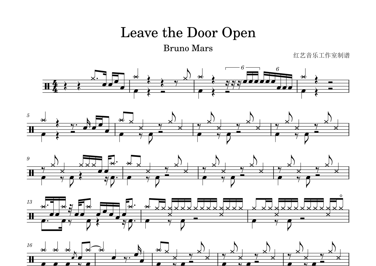 《Leave the Door Open》是Bruno Mars演唱的一首歌曲,五线谱,拍号为4/4拍,歌曲速度为每分钟74拍,这份架子鼓谱共有两张高清图谱,图谱由 @꧁汶歌꧂ 编配上传,图谱使用五线谱编配,使用这份Leave the Door Open架子鼓谱,你将能够轻松地敲打出这首Bruno Mars的Leave the Door Open,快来尝试吧。