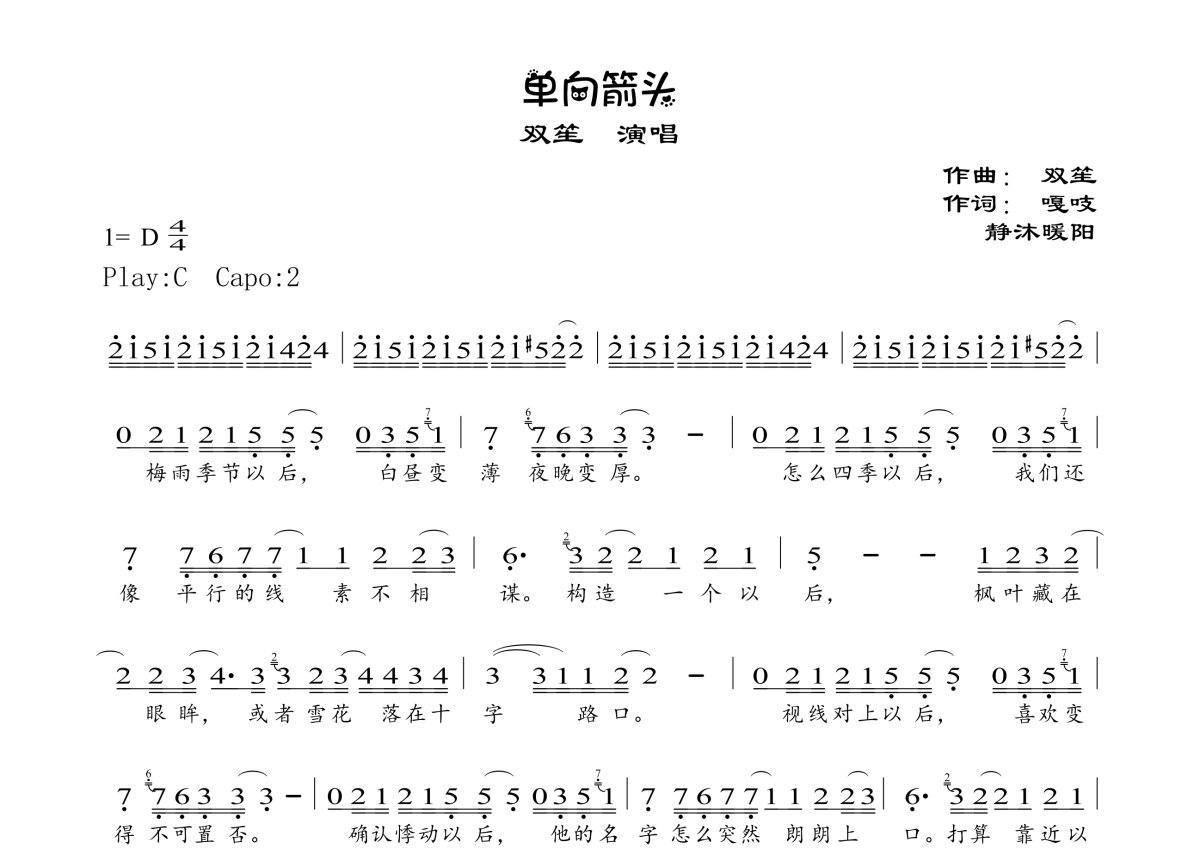 《单向箭头》是双笙演唱的一首歌曲,拍号为4/4拍,这份简谱共有两张高清图谱,图谱由 @静沐暖阳 编配上传。
