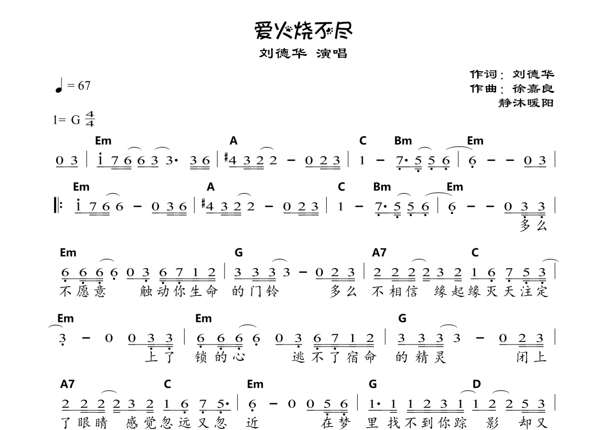 《爱火烧不尽》是刘德华演唱的一首歌曲,拍号为4/4拍,歌曲速度为每分钟67拍,这份简谱共有一张高清图谱,图谱由 @静沐暖阳 编配上传和弦简谱。