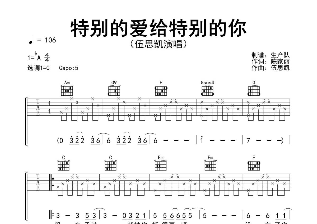 《特别的爱给特别的你》是伍思凯演唱的一首歌曲,精编完美版,拍号为4/4拍,歌曲速度为每分钟106拍,歌曲原调为Ab调,但由于原调指法比较难,为了方便弹奏,本吉他谱采用的是C调指法编配,变调夹5品弹奏即为原调,当然也可以根据自己的音域改变变调夹位置,或者通过改变和弦调性,以方便自己弹奏,这份吉他谱共有三张高清图谱,图谱由 @生产队 编配上传,图谱使用六线谱编配,包含吉他和弦指法、简谱以及歌词部分,使用这份特别的爱给特别的你吉他谱,可以让你更加方便地掌握这首歌曲的弹唱技巧,快来尝试吧。《特别的爱给特别的你》是伍思凯演唱的一首歌曲,由陈家丽作词,收录在伍思凯1990年7月6日发行的同名专辑《特别的爱给特别的你》中,该曲是伍思凯的成名之作,也是电影《沙滩仔与周师奶》的主题曲。本吉他谱根据原版采用C调指法编配,完整的前奏、间奏、尾奏编配,怀旧经典!。