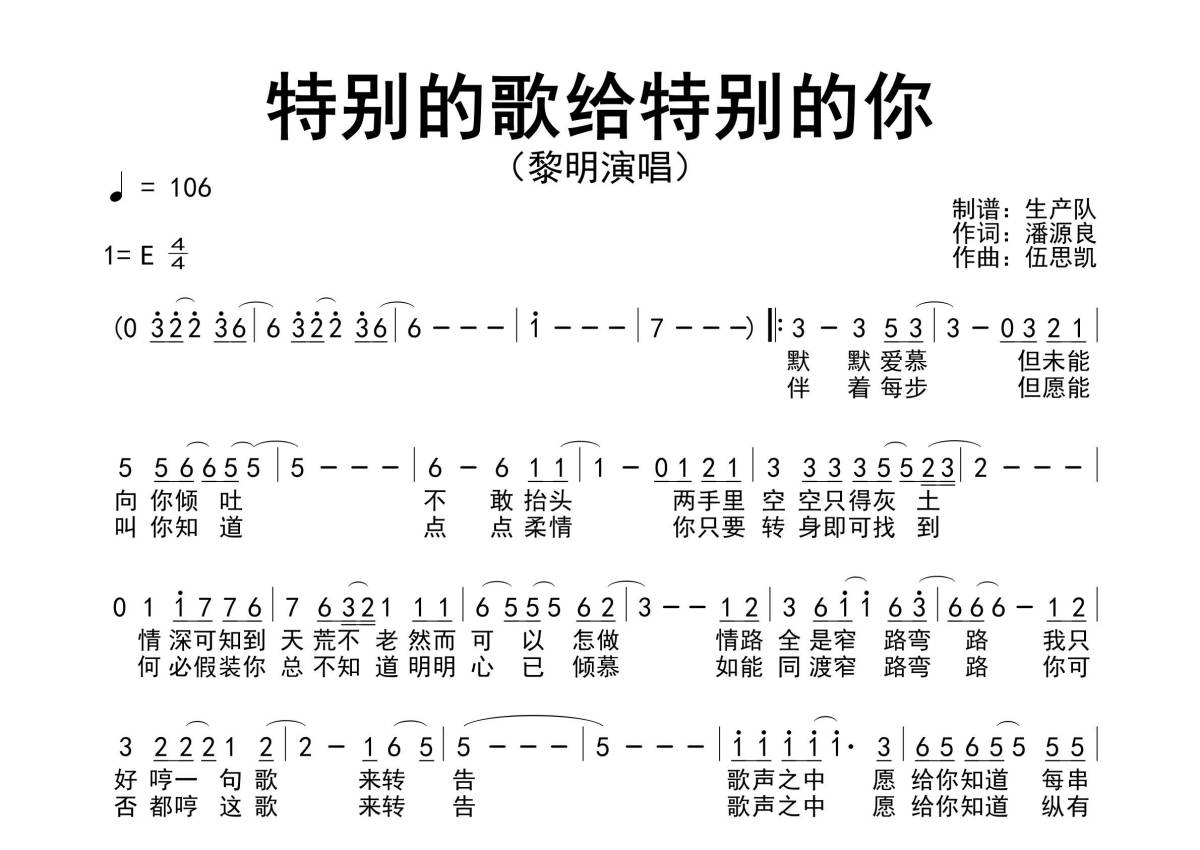 《特别的歌给特别的你》是黎明演唱的一首歌曲,原版简谱,拍号为4/4拍,歌曲速度为每分钟106拍,这份简谱共有一张高清图谱,图谱由 @生产队 编配上传黎明演唱的经典歌曲《特别的歌给特别的你》原版简谱。
