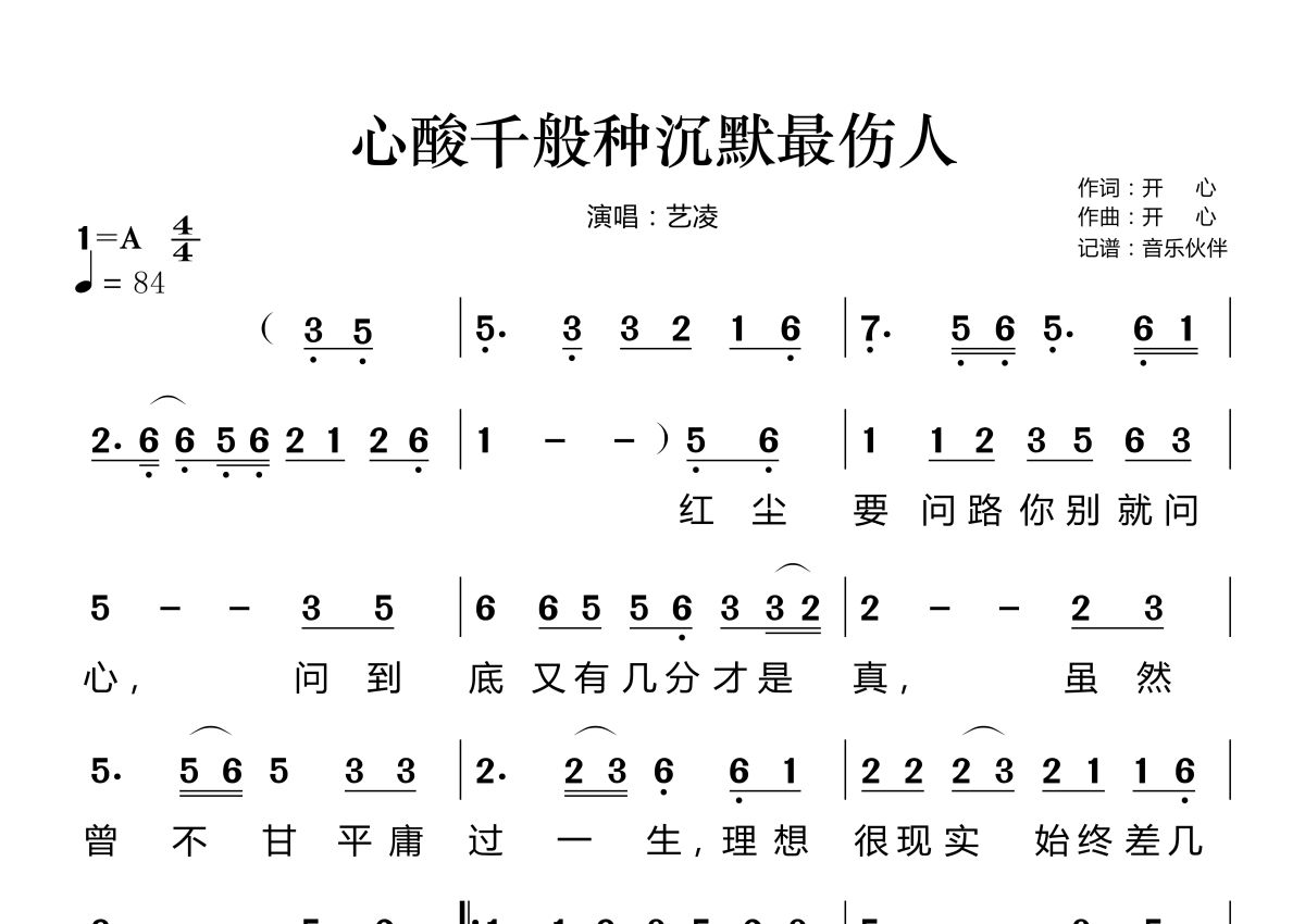 《心酸千般种沉默最伤人》是艺凌演唱的一首歌曲,这份简谱共有两张高清图谱,图谱由 @音乐伙伴 编配上传。