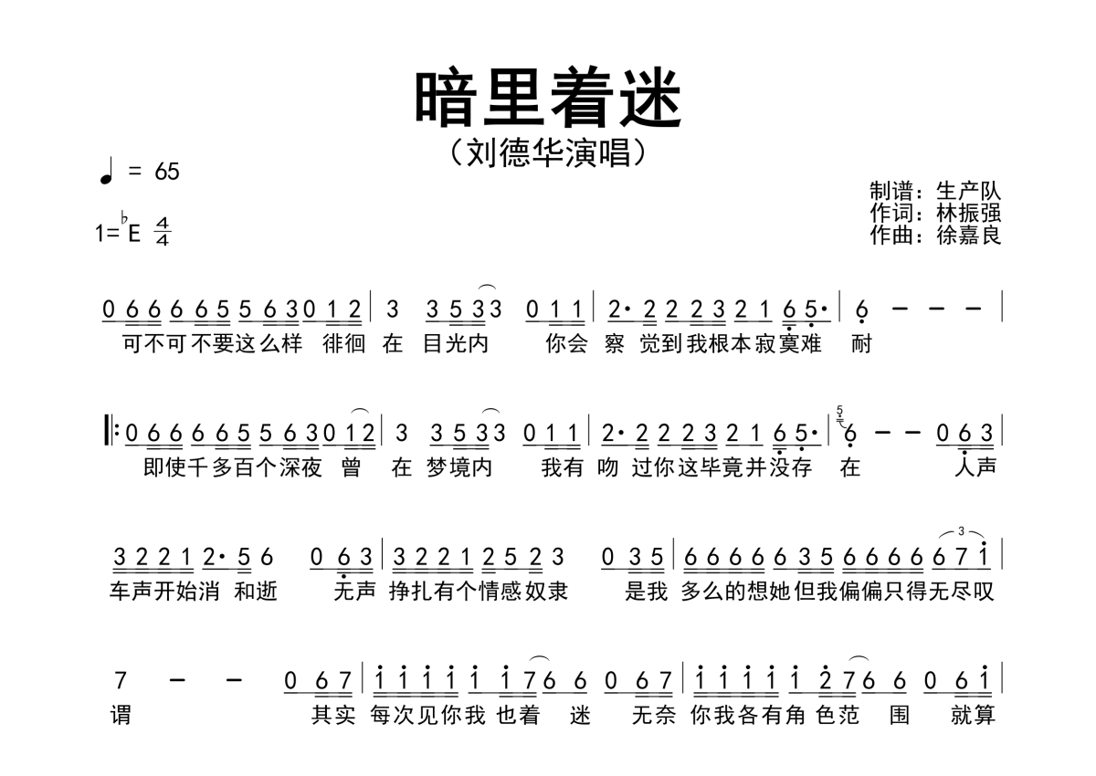 《暗里着迷》是刘德华演唱的一首歌曲,简谱,拍号为4/4拍,歌曲速度为每分钟65拍,这份简谱共有一张高清图谱,图谱由 @生产队 编配上传刘德华演唱的歌曲《暗里着迷》简谱。