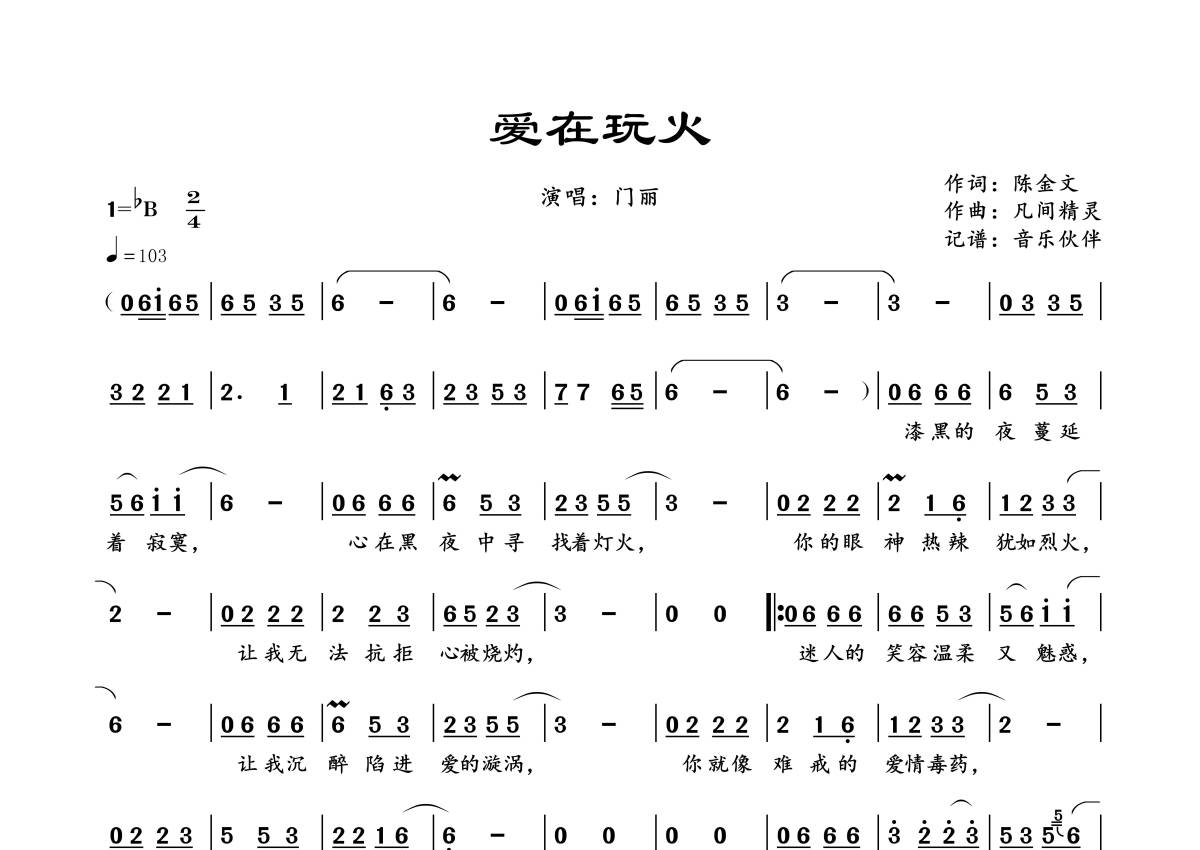 《爱在玩火》是门丽演唱的一首歌曲,拍号为2/4拍,歌曲速度为每分钟103拍,这份简谱共有一张高清图谱,图谱由 @音乐伙伴 编配上传。