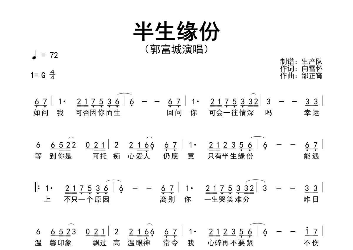 《半生缘份》是郭富城演唱的一首歌曲,简谱,拍号为4/4拍,歌曲速度为每分钟72拍,这份简谱共有一张高清图谱,图谱由 @生产队 编配上传郭富城演唱的歌曲《半生缘份》简谱。