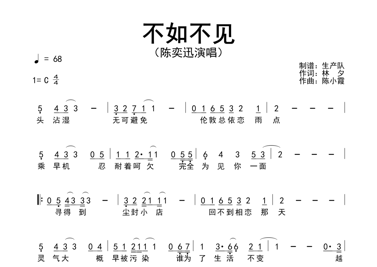 《不如不见》是陈奕迅演唱的一首歌曲,拍号为4/4拍,歌曲速度为每分钟68拍,这份简谱共有一张高清图谱,图谱由 @生产队 编配上传陈奕迅演唱的歌曲《不如不见》简谱。