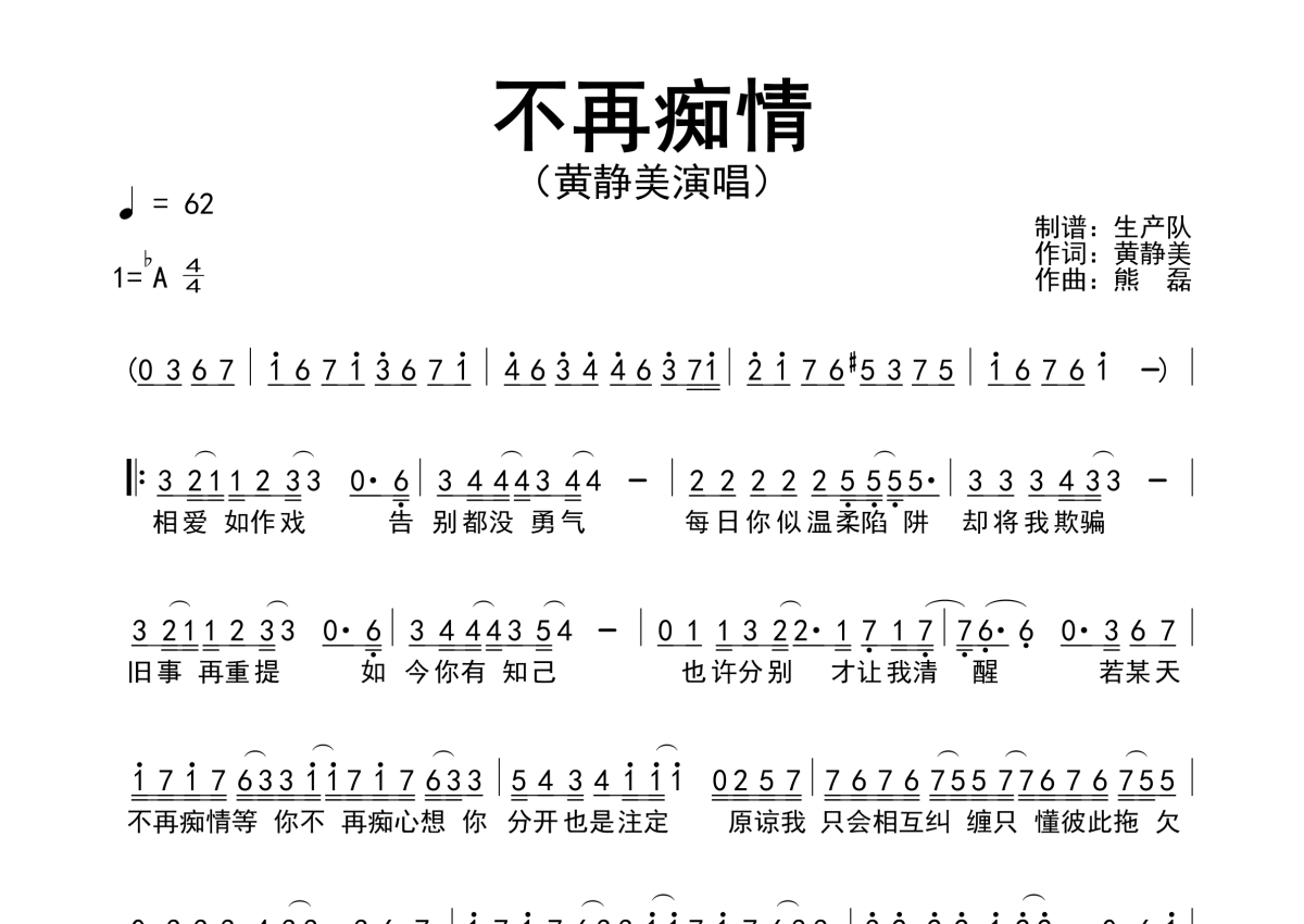 《不再痴情》是黄静美演唱的一首歌曲,简谱,拍号为4/4拍,歌曲速度为每分钟62拍,这份简谱共有一张高清图谱,图谱由 @生产队 编配上传黄静美演唱的歌曲《不再痴情》简谱。