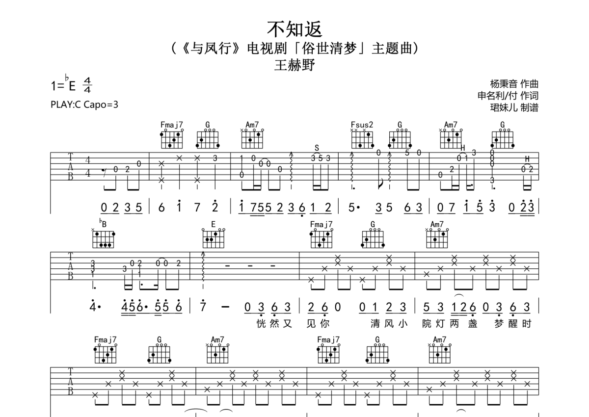 王赫野《不知返》吉他谱 - C调弹唱六线谱