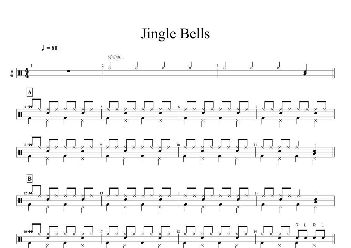 《Jingle Bells》,这份鼓谱共有一张高清图谱,图谱由 @打鼓谱 编配上传,图谱使用五线谱编配,使用这份Jingle Bells架子鼓谱,你将能够轻松地敲打出这首Jingle Bells,快来尝试吧。《铃儿响叮当》是詹姆斯·罗德·皮尔彭特作词作曲的一首儿童歌曲,1857年美国波士顿假日学校的学生在教堂有一场感恩节演唱,并很快成为了一首脍炙人口的经典圣诞歌曲。