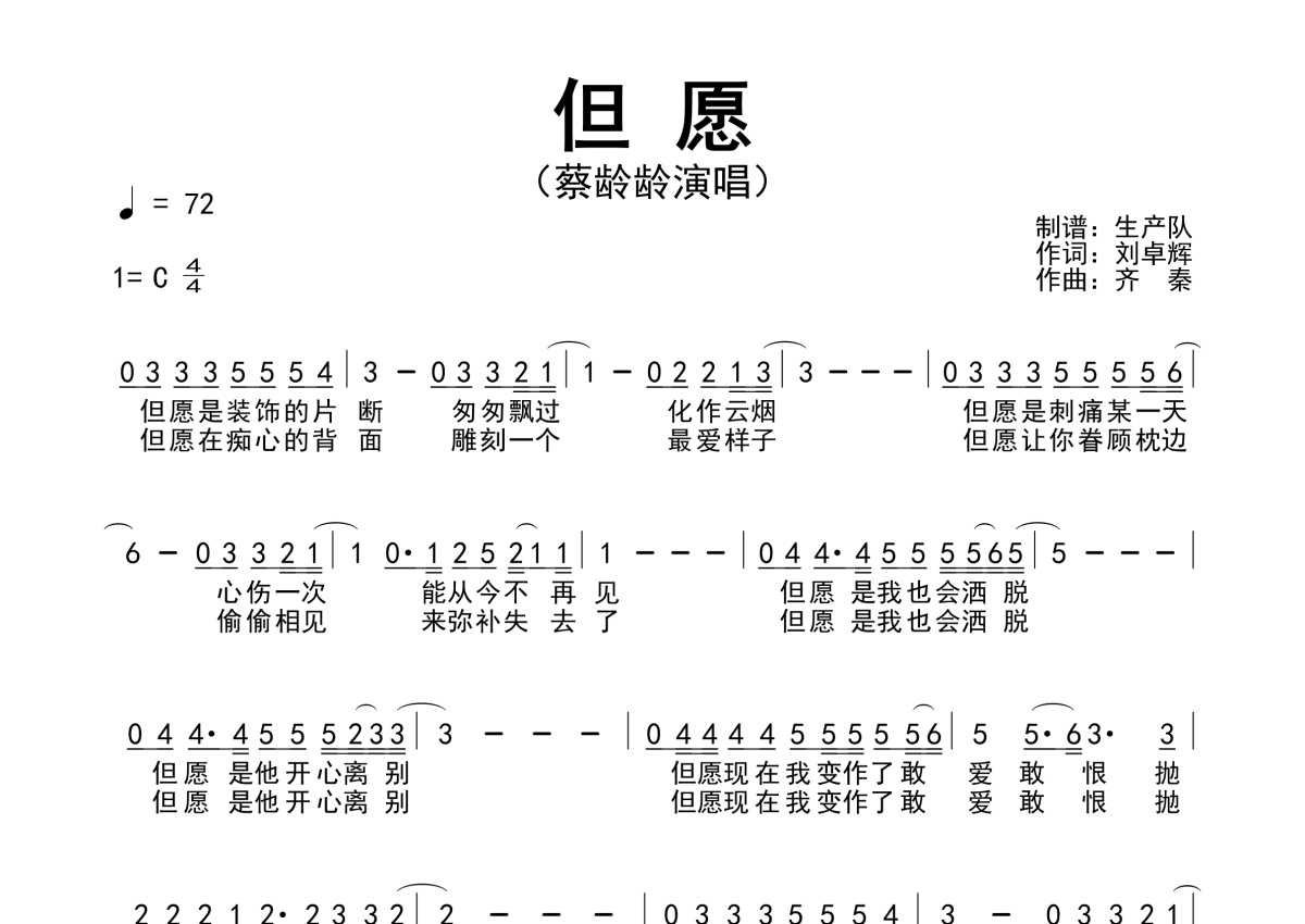 《但愿》是蔡龄龄演唱的一首歌曲,拍号为4/4拍,歌曲速度为每分钟72拍,这份简谱共有一张高清图谱,图谱由 @生产队 编配上传蔡龄龄演唱的歌曲《但愿》简谱。