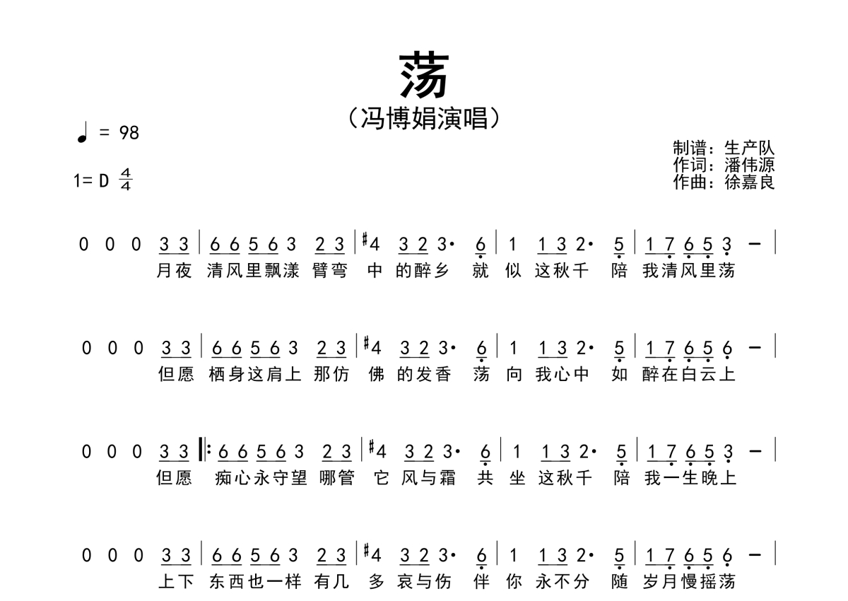 《荡》是冯博娟演唱的一首歌曲,拍号为4/4拍,歌曲速度为每分钟98拍,这份简谱共有一张高清图谱,图谱由 @生产队 编配上传冯博娟演唱的歌曲《荡》简谱。