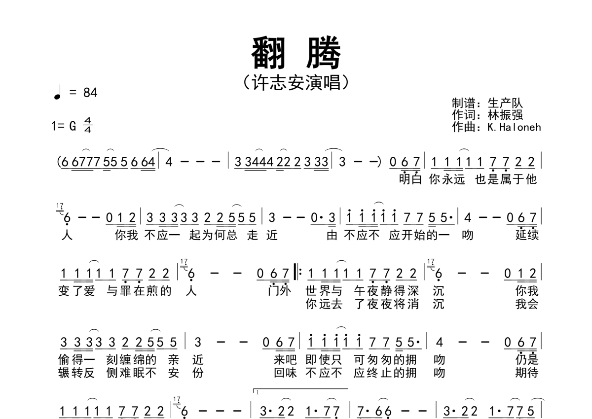 《翻腾》是许志安演唱的一首歌曲,拍号为4/4拍,歌曲速度为每分钟84拍,这份简谱共有一张高清图谱,图谱由 @生产队 编配上传许志安演唱的歌曲《翻腾》简谱。