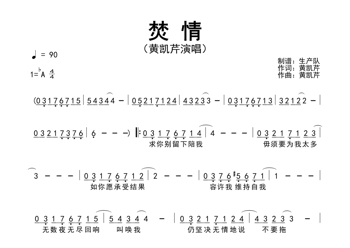 《焚情》是黄凯芹演唱的一首歌曲,拍号为4/4拍,歌曲速度为每分钟90拍,这份简谱共有一张高清图谱,图谱由 @生产队 编配上传黄凯芹演唱的歌曲《焚情》简谱。