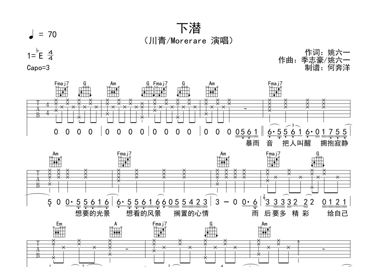 川青/Morerare《下潜》吉他谱 - C调弹唱六线谱