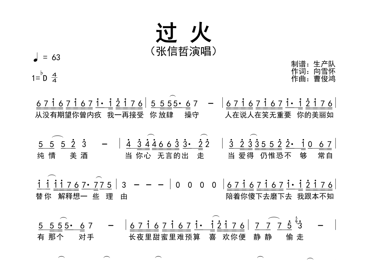 《过火》是张信哲演唱的一首歌曲,粤语版,拍号为4/4拍,歌曲速度为每分钟63拍,这份简谱共有一张高清图谱,图谱由 @生产队 编配上传张信哲演唱的歌曲《过火》(粤语版)简谱。