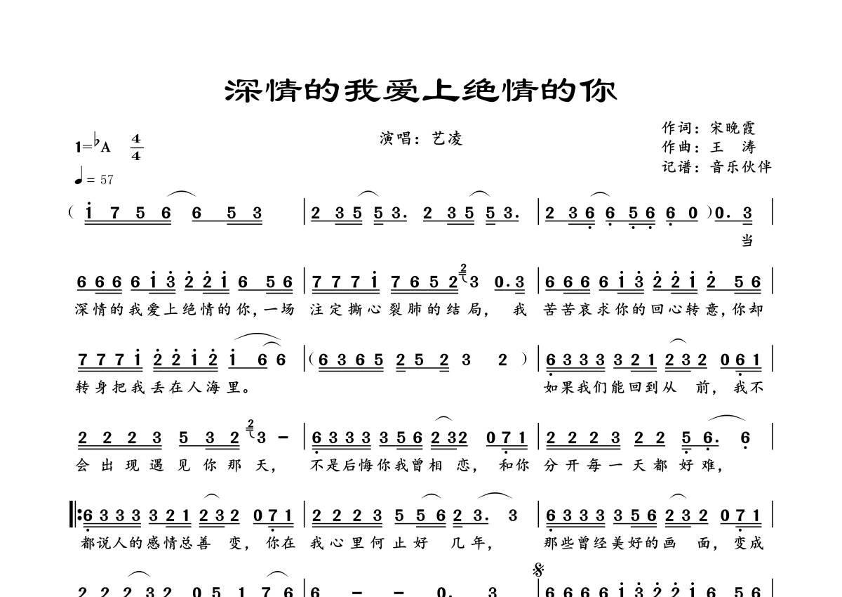 《深情的我爱上绝情的你》是艺凌演唱的一首歌曲,拍号为4/4拍,歌曲速度为每分钟57拍,这份简谱共有一张高清图谱,图谱由 @音乐伙伴 编配上传。