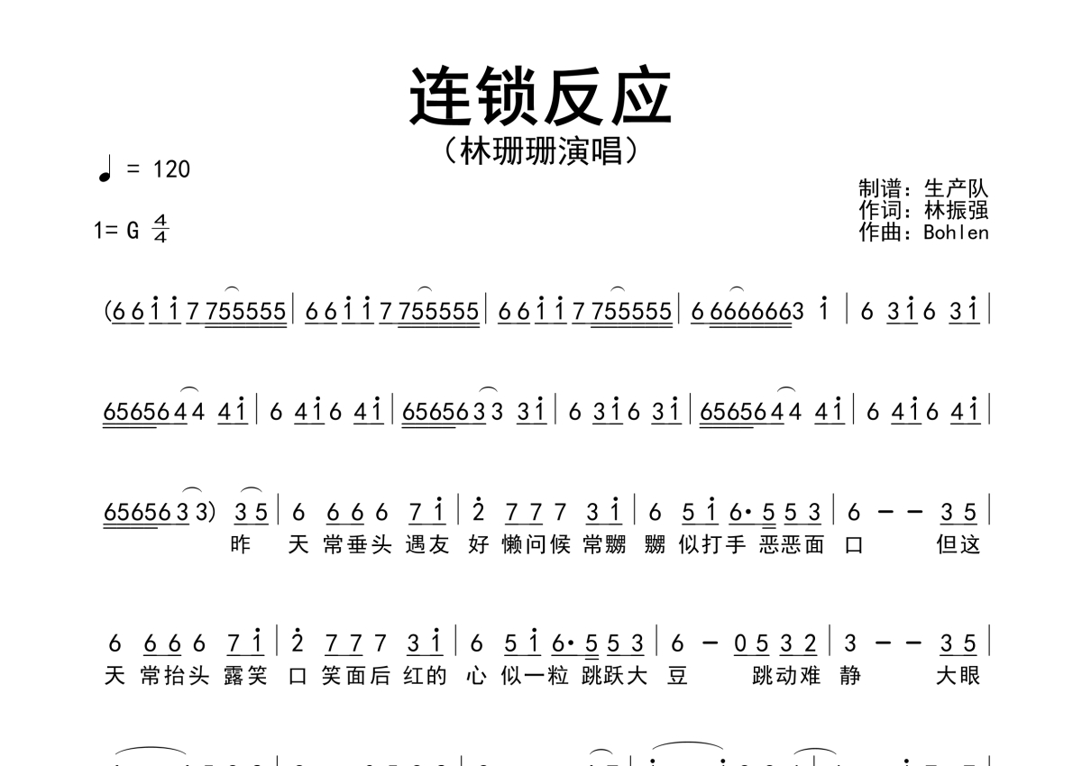 《连锁反应》是林珊珊演唱的一首歌曲,简谱,拍号为4/4拍,歌曲速度为每分钟120拍,这份简谱共有两张高清图谱,图谱由 @生产队 编配上传林珊珊演唱的歌曲《连锁反应》简谱。