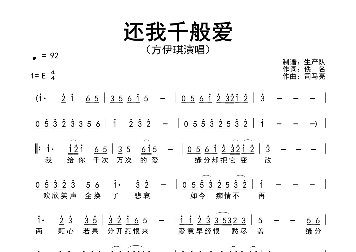 《还我千般爱》是方伊琪演唱的一首歌曲,简谱,拍号为4/4拍,歌曲速度为每分钟92拍,这份简谱共有一张高清图谱,图谱由 @生产队 编配上传方伊琪演唱的歌曲《还我千般爱》简谱。