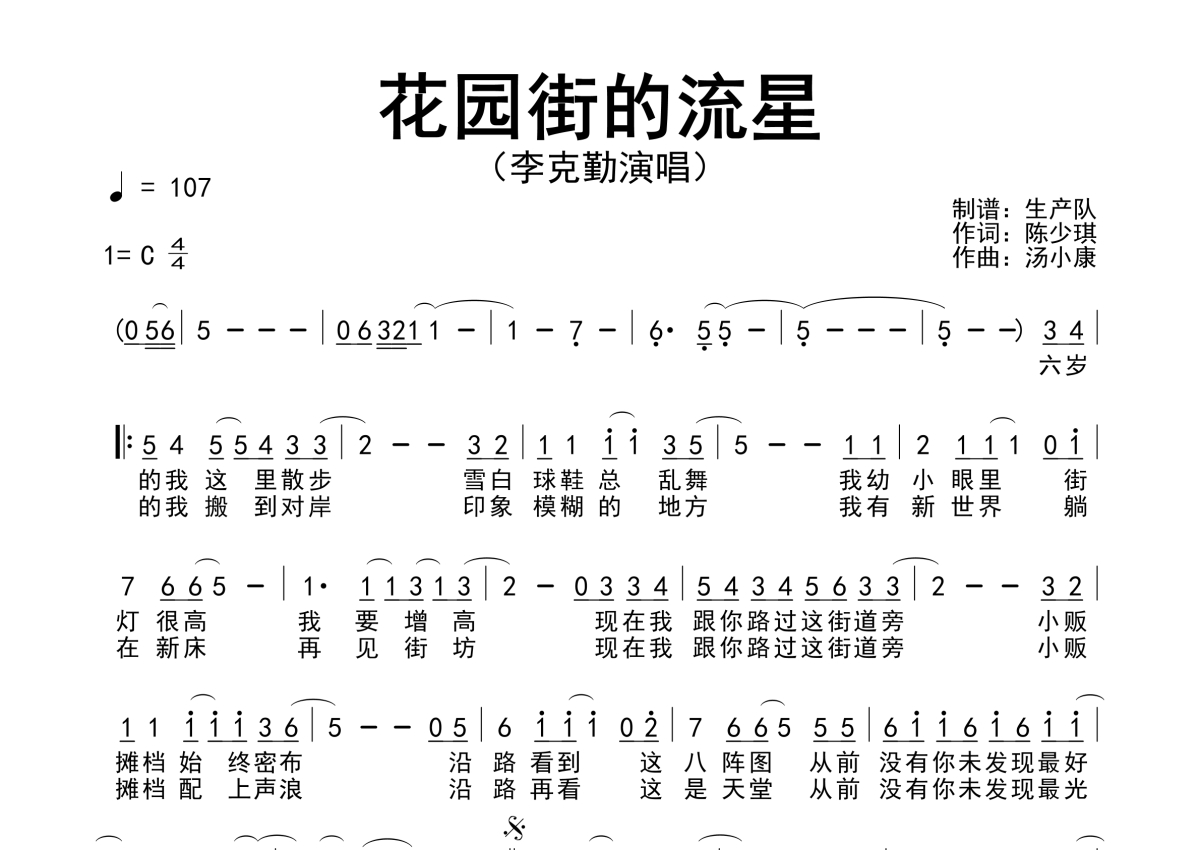 《花园街的流星》是李克勤演唱的一首歌曲,简谱,拍号为4/4拍,歌曲速度为每分钟107拍,这份简谱共有一张高清图谱,图谱由 @生产队 编配上传李克勤演唱的歌曲《花园街的流星》简谱。