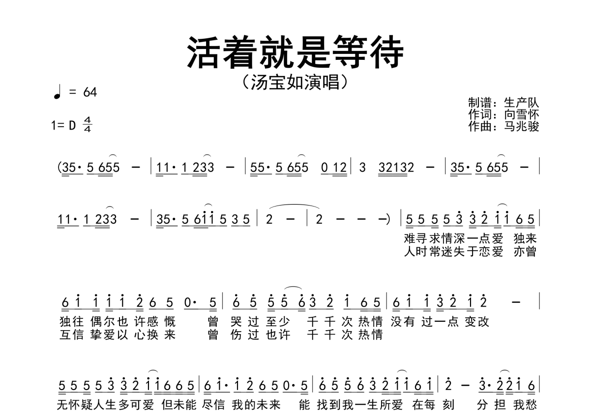 《活着就是等待》是汤宝如演唱的一首歌曲,简谱,拍号为4/4拍,歌曲速度为每分钟64拍,这份简谱共有一张高清图谱,图谱由 @生产队 编配上传汤宝如演唱的歌曲《活着就是等待》简谱。