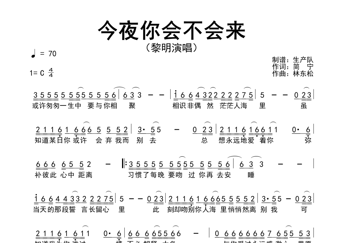 《今夜你会不会来》是黎明演唱的一首歌曲,粤语版,拍号为4/4拍,歌曲速度为每分钟70拍,这份简谱共有一张高清图谱,图谱由 @生产队 编配上传黎明演唱的歌曲《今夜你会不会来》(粤语版)简谱。