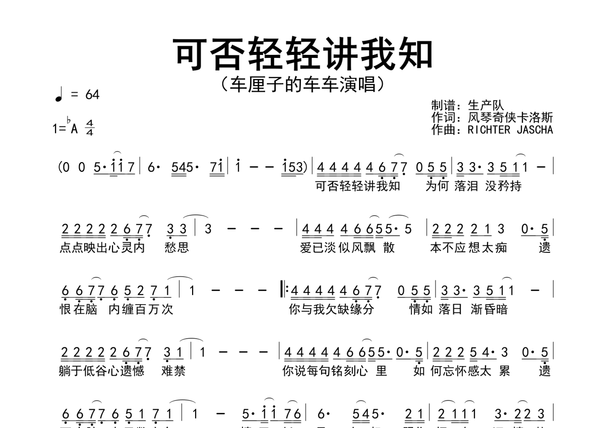 《可否轻轻讲我知》是车厘子的车车演唱的一首歌曲,简谱,拍号为4/4拍,歌曲速度为每分钟64拍,这份简谱共有一张高清图谱,图谱由 @生产队 编配上传车厘子的车车演唱的歌曲《可否轻轻讲我知》简谱。