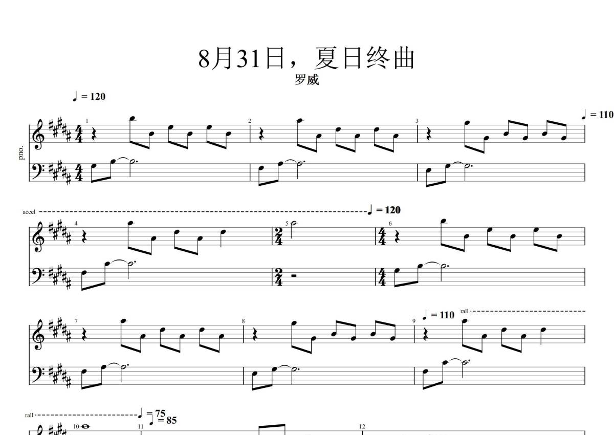 《8月31日,夏日终曲》是罗威演唱的一首歌曲,拍号为4/4拍,歌曲速度为每分钟120拍,这份钢琴谱共有四张高清图谱,图谱由 @Golder 编配上传,曲谱配备了相关的音频提供试听,使用这份8月31日,夏日终曲钢琴谱,可以让你更加方便地掌握这首歌曲的演奏技巧,快来尝试吧。