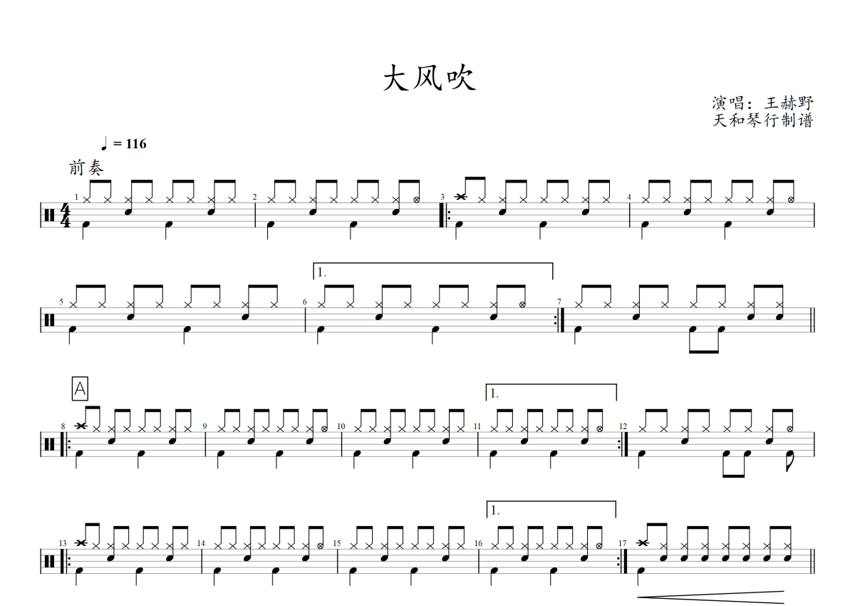 王赫野《大风吹》架子鼓谱