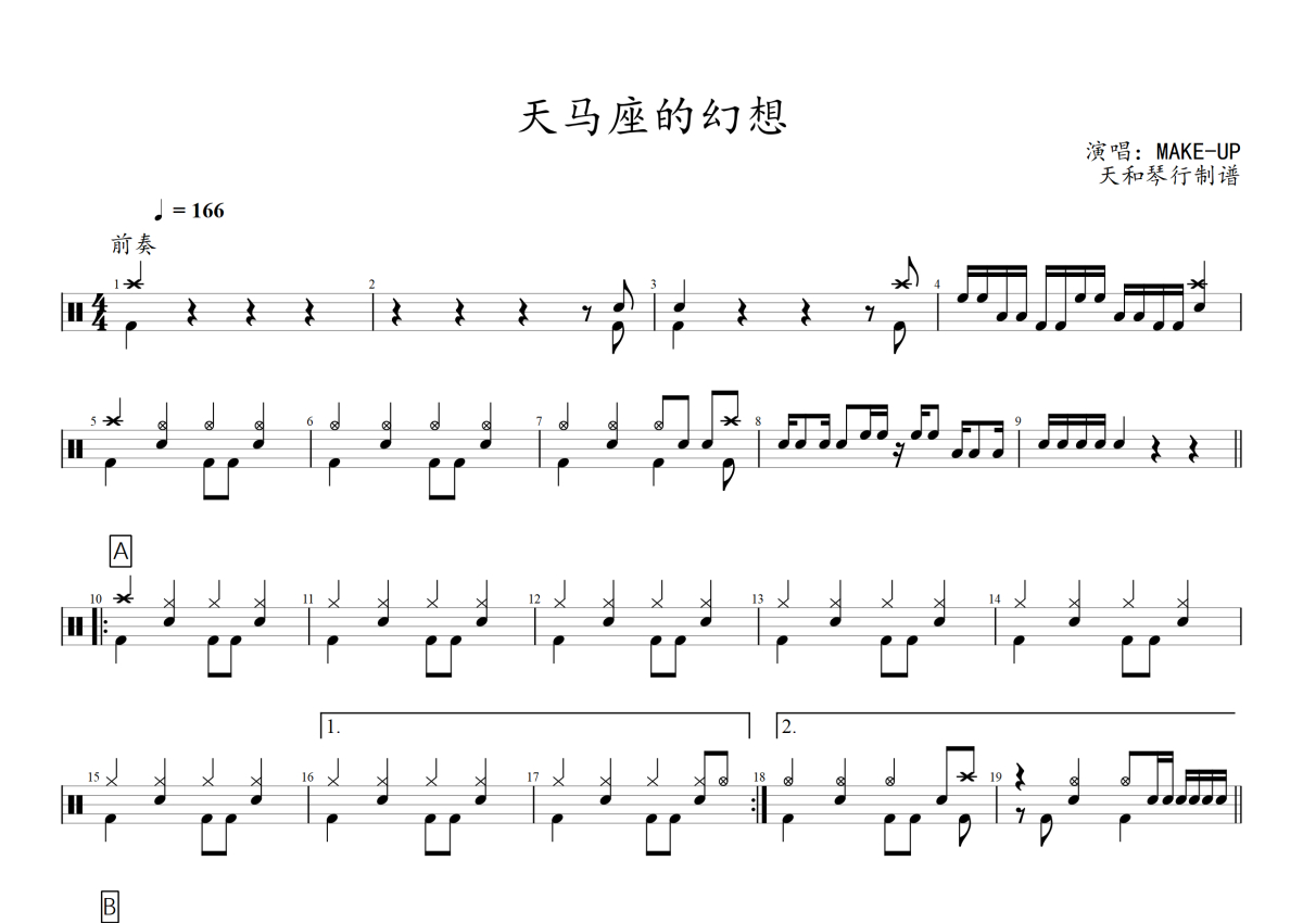 《天马座的幻想》是MAKE-UP演唱的一首歌曲,拍号为4/4拍,歌曲速度为每分钟166拍,这份架子鼓谱共有三张高清图谱,图谱由 @音符喷血者 编配上传,图谱使用五线谱编配,使用这份天马座的幻想架子鼓谱,你将能够轻松地敲打出这首MAKE-UP的天马座的幻想,快来尝试吧。