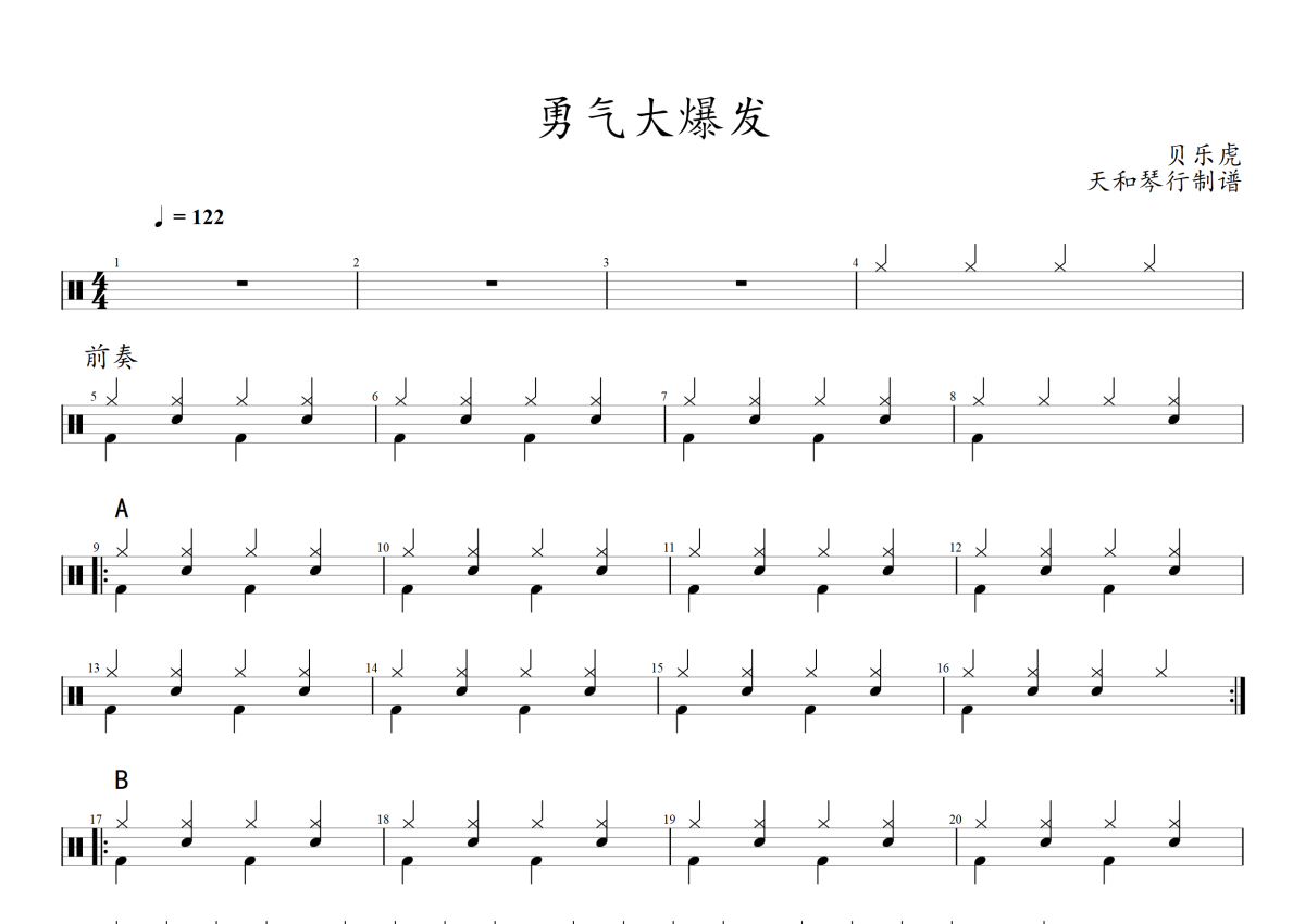 《勇气大爆发》是贝乐虎演唱的一首歌曲,拍号为4/4拍,歌曲速度为每分钟122拍,这份架子鼓谱共有两张高清图谱,图谱由 @音符喷血者 编配上传,图谱使用五线谱编配,使用这份勇气大爆发架子鼓谱,你将能够轻松地敲打出这首贝乐虎的勇气大爆发,快来尝试吧。