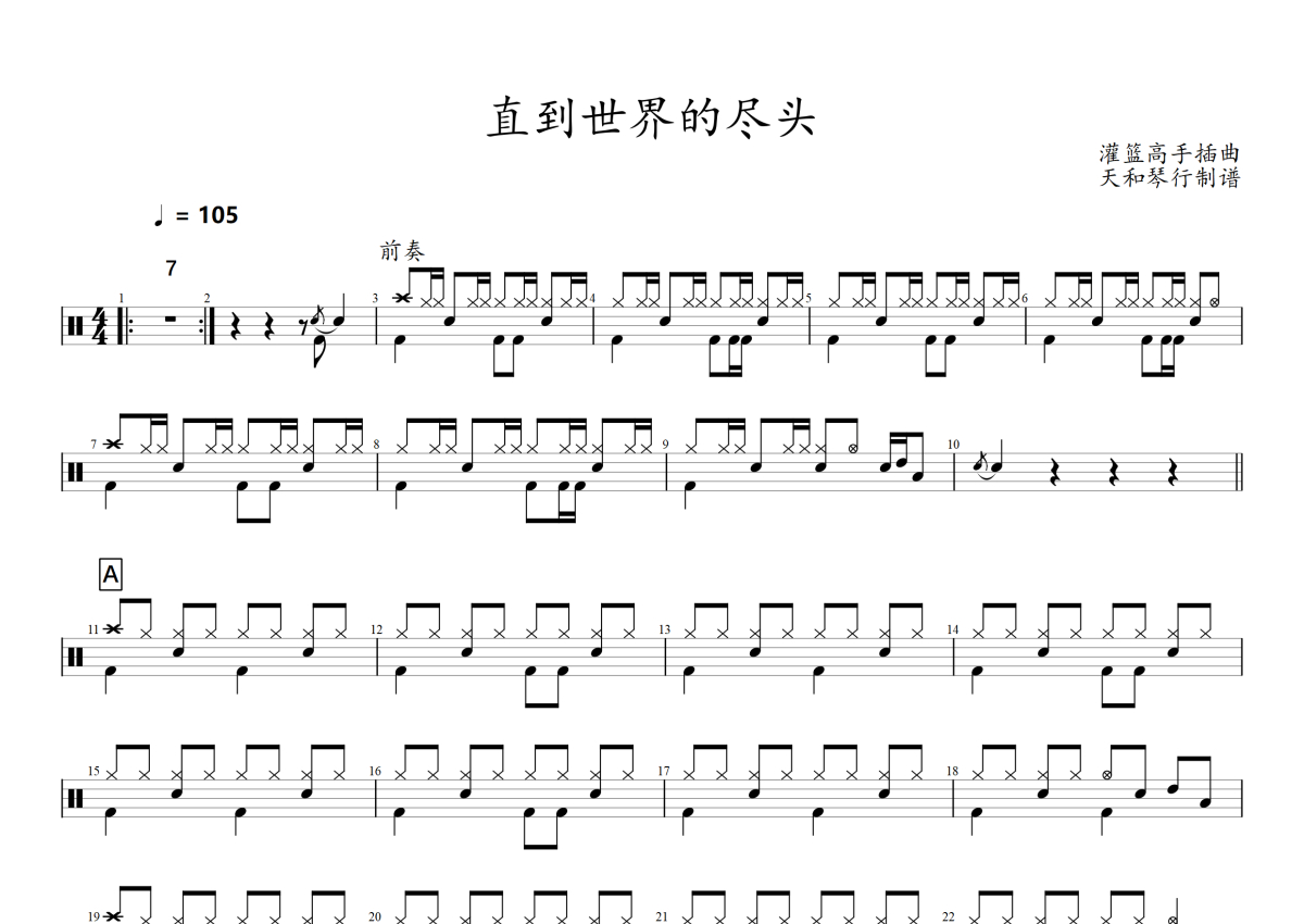 《直到世界的尽头》是WANDS演唱的一首歌曲,拍号为4/4拍,歌曲速度为每分钟105拍,这份架子鼓谱共有三张高清图谱,图谱由 @音符喷血者 编配上传,图谱使用五线谱编配,使用这份直到世界的尽头架子鼓谱,你将能够轻松地敲打出这首WANDS的直到世界的尽头,快来尝试吧。