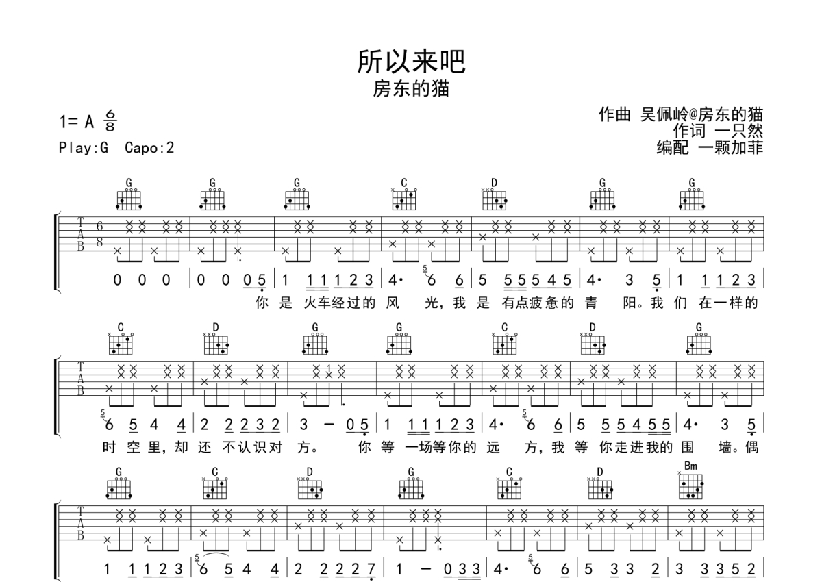 所以来吧吉他谱 - 房东的猫 - G调弹唱六线谱