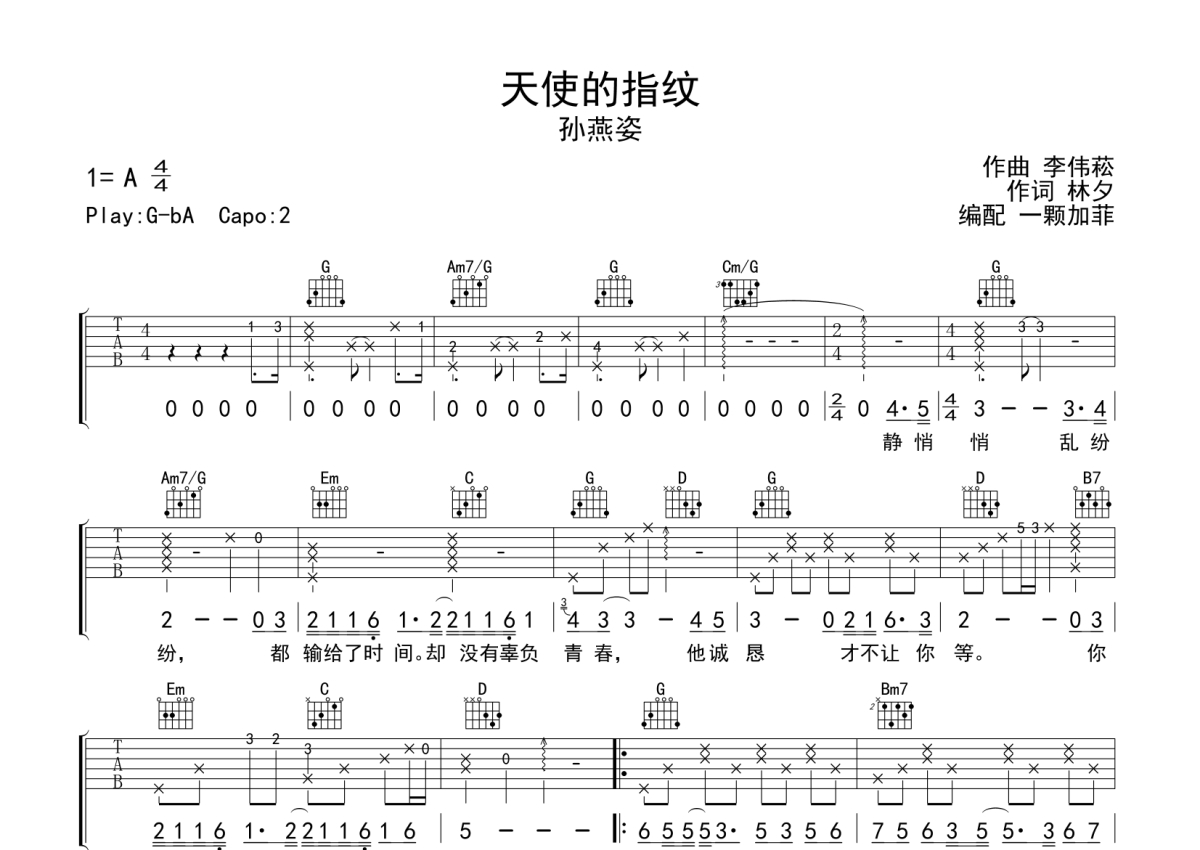 孙燕姿《天使的指纹》吉他谱 - G调弹唱六线谱