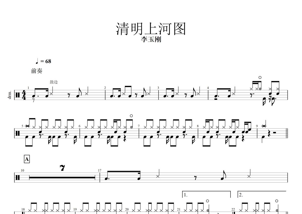 《清明上河图》是李玉刚演唱的一首歌曲,这份鼓谱共有两张高清图谱,图谱由 @打鼓谱 编配上传,图谱使用五线谱编配,使用这份清明上河图架子鼓谱,你将能够轻松地敲打出这首李玉刚的清明上河图,快来尝试吧。《清明上河图》是李玉刚的代表作之一,也是著名音乐人胡力为其量身打造的歌曲,词曲为高进,收录在2010年发行的专辑《新贵妃醉酒》中。 《清明上河图》将京剧、流行音乐巧妙结合, 加上李玉刚的“双声”唱法,使得这首歌曲充满了“李玉刚韵味”。