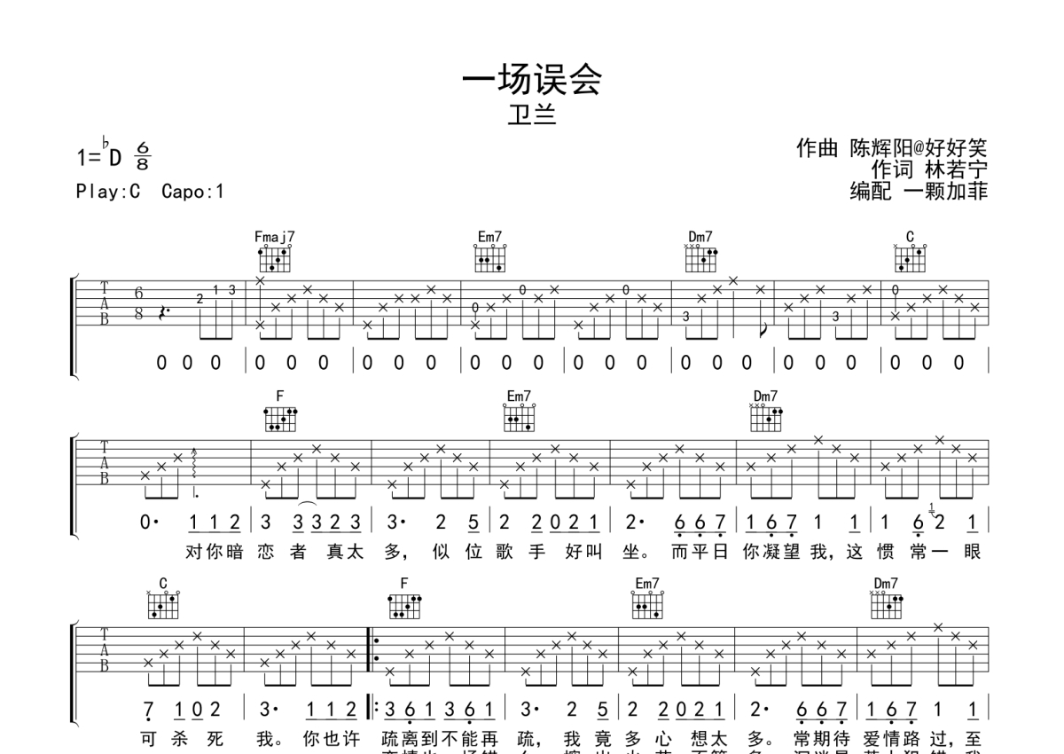 卫兰《一场误会》吉他谱 - C调弹唱六线谱