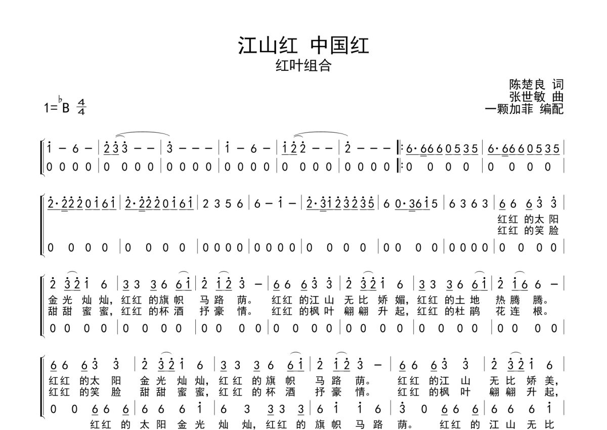 《江山红中国红》是红叶组合演唱的一首歌曲,拍号为4/4拍,这份简谱共有一张高清图谱,图谱由 @一颗加菲 编配上传。