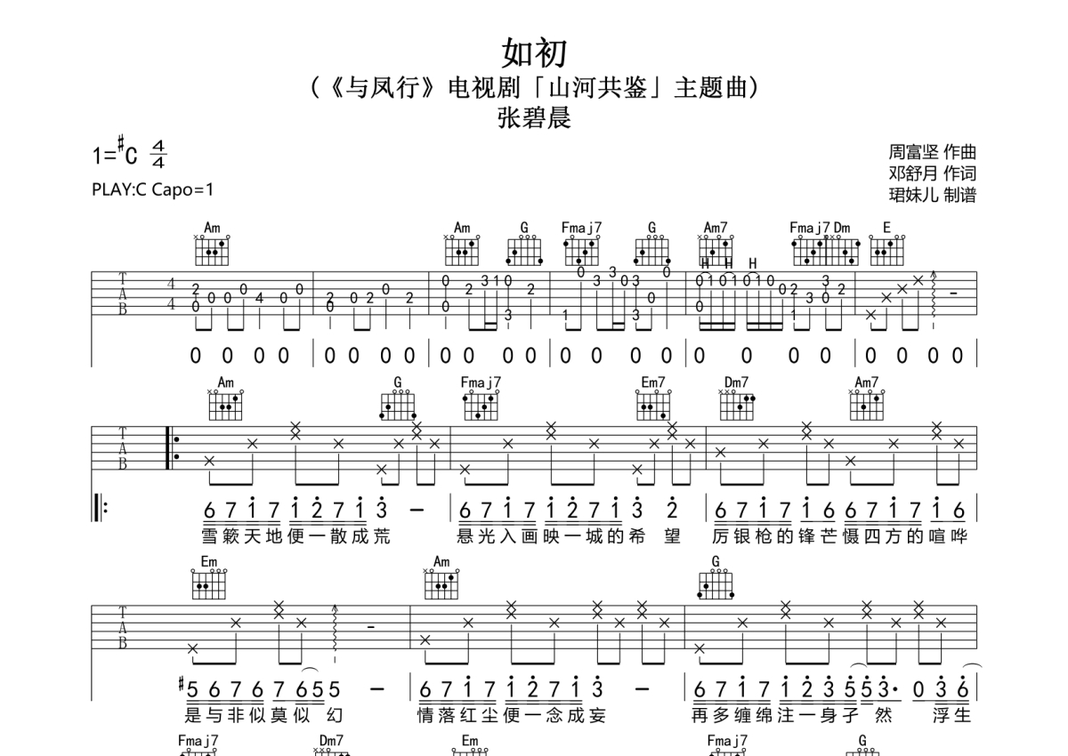 《如初》是张碧晨演唱的一首歌曲,拍号为4/4拍,歌曲速度为每分钟85拍,歌曲原调为C调,本吉他谱采用的是C调指法编配,变调夹1品弹奏即为原调,当然也可以根据自己的音域改变变调夹位置,或者通过改变和弦调性,以方便自己弹奏,这份吉他谱共有两张高清图谱,图谱由 @珺妹儿 编配上传,图谱使用六线谱编配,包含吉他和弦指法、简谱以及歌词部分,使用这份如初吉他谱,可以让你更加方便地掌握这首歌曲的弹唱技巧,快来尝试吧。