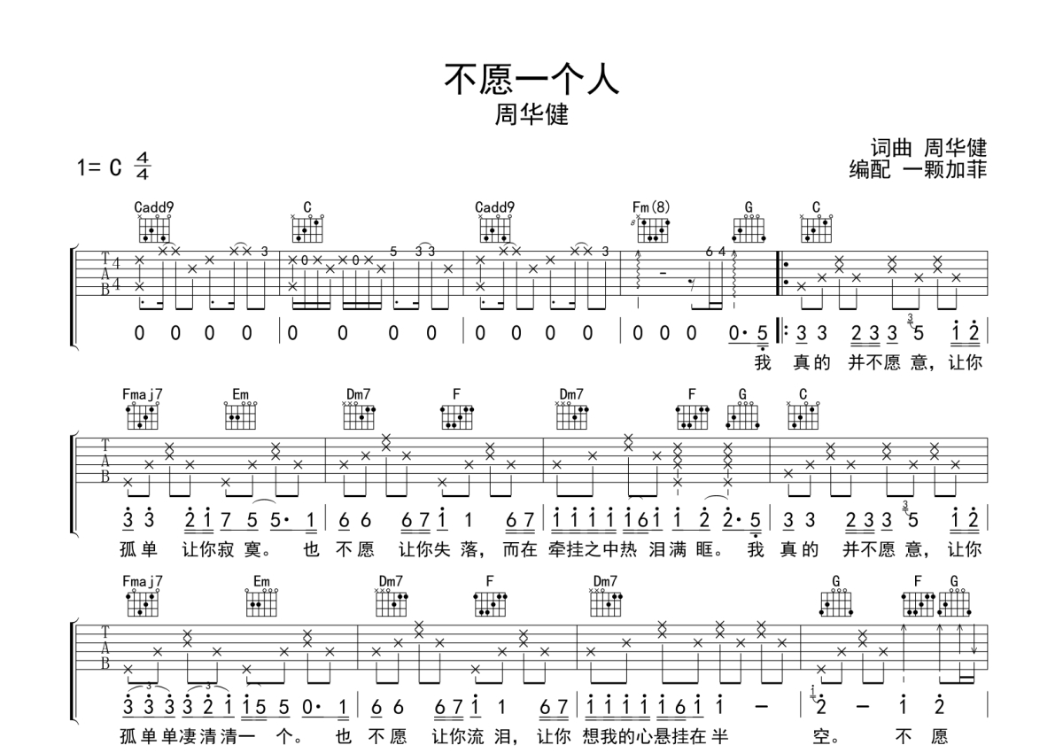 周华健《不愿一个人》吉他谱 - C调弹唱六线谱