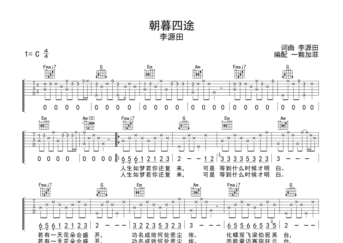 李源田《朝暮四途》吉他谱 - C调弹唱六线谱