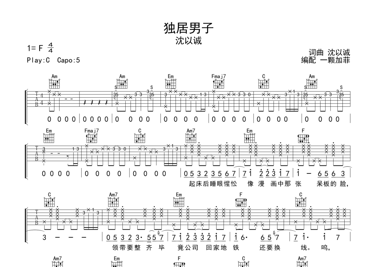 沈以诚《独居男子》吉他谱 - C调弹唱六线谱