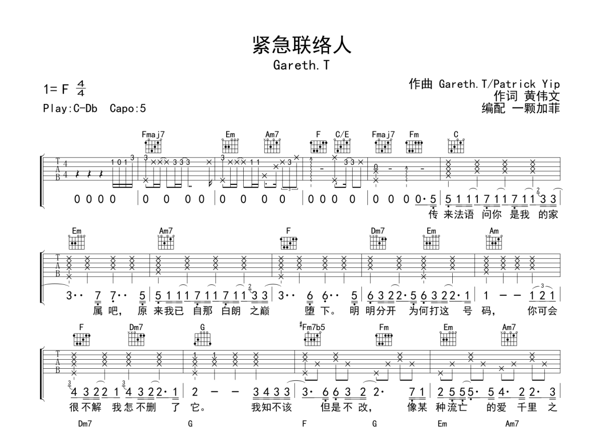 Gareth.T《紧急联络人》吉他谱 - C调弹唱六线谱