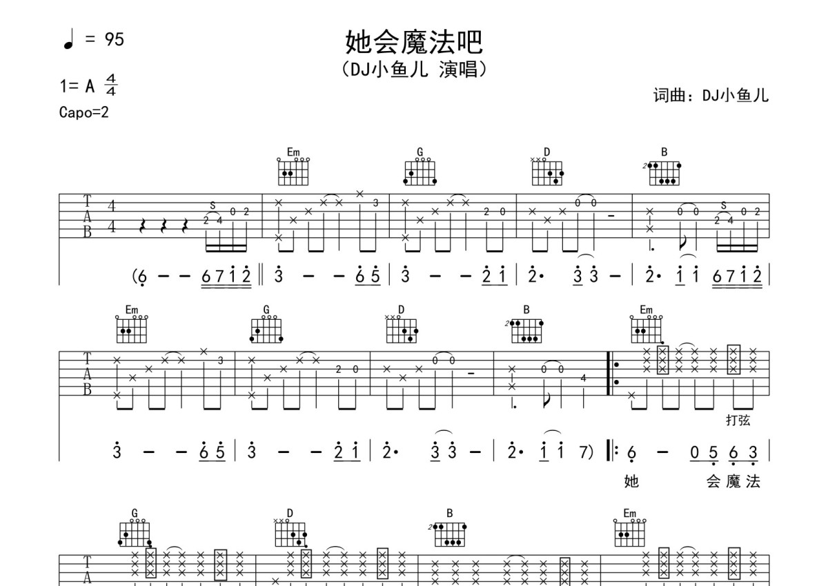 DJ小鱼儿《她会魔法吧》吉他谱 - G调弹唱六线谱