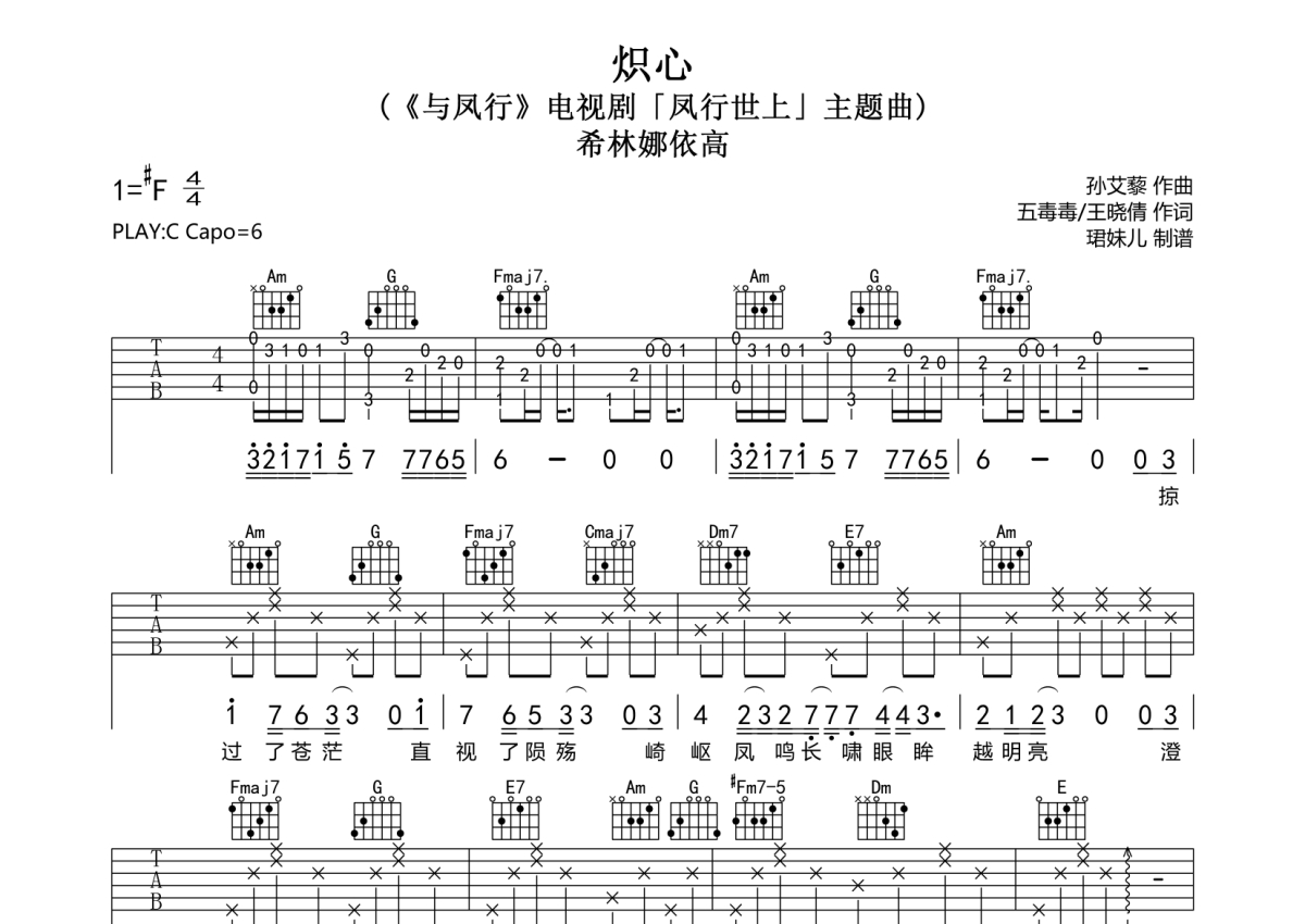 《炽心》是希林娜依高演唱的一首歌曲,拍号为4/4拍,歌曲速度为每分钟85拍,歌曲原调为F调,但由于原调指法比较难,为了方便弹奏,本吉他谱采用的是C调指法编配,变调夹6品弹奏即为原调,当然也可以根据自己的音域改变变调夹位置,或者通过改变和弦调性,以方便自己弹奏,这份吉他谱共有两张高清图谱,图谱由 @珺妹儿 编配上传,图谱使用六线谱编配,包含吉他和弦指法、简谱以及歌词部分,使用这份炽心吉他谱,可以让你更加方便地掌握这首歌曲的弹唱技巧,快来尝试吧。