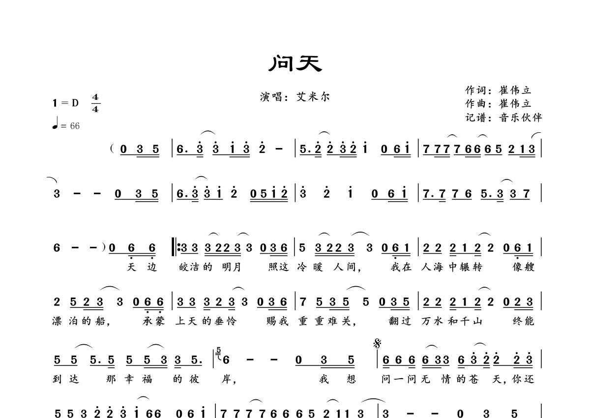 《问天》是艾米尔演唱的一首歌曲,拍号为4/4拍,歌曲速度为每分钟66拍,这份简谱共有一张高清图谱,图谱由 @音乐伙伴 编配上传。